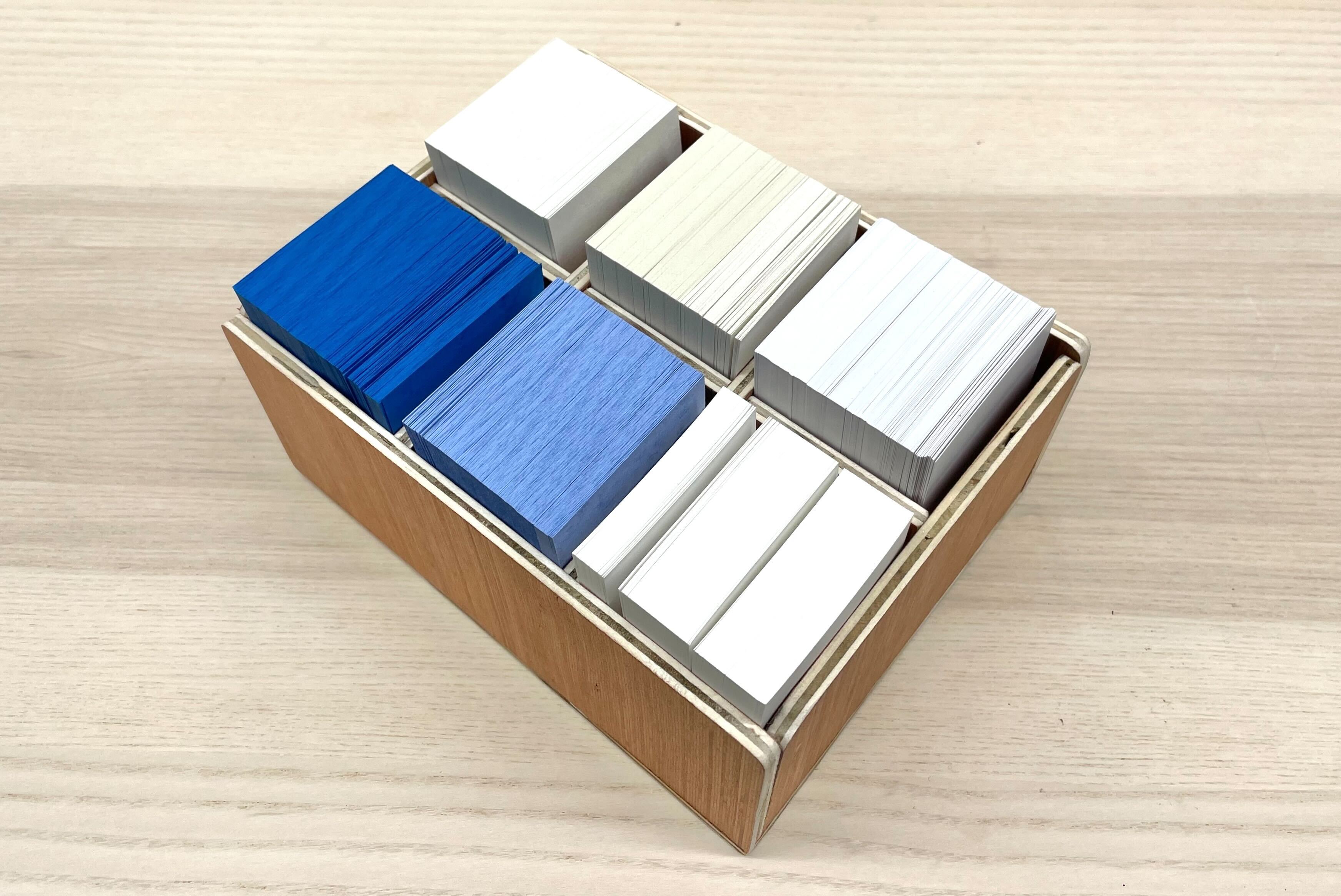 330円(税込)で紙屋がチョイスした名刺サイズの紙の端材を詰め放題でお持ち帰りいただけます。